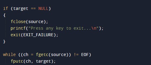 #include <stdio.h> #include <stdlib.h> int main() { //declaring the variables for the program char ch, source_file[20], target_file[20]; FILE *source, *target; //taking input file from the user to copy printf("Enter name of file to copy\n"); gets(source_file); source = fopen(source_file, "r"); if (source == NULL) { printf("Press any key to exit...\n"); exit(EXIT_FAILURE); } //Printing the output for the program printf("Enter name of target file\n"); gets(target_file); target = fopen(target_file, "w"); if (target == NULL) { fclose(source); printf("Press any key to exit...\n"); exit(EXIT_FAILURE); } while ((ch = fgetc(source)) != EOF) fputc(ch, target); //output message for successful copy of the file printf("File copied successfully.\n"); fclose(source); fclose(target); return 0; } |