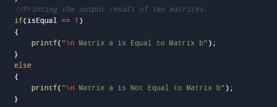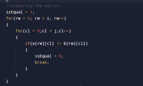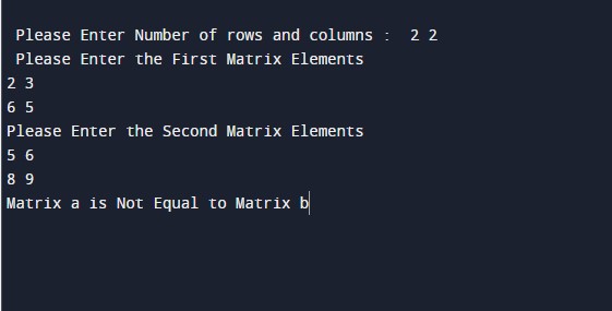In this tutorial, we will check the matrix is equal or not with the help of the c programming. First, we will take the size and the elements of the matrix. Then we will check the matrix is equal or not using the for loop and the conditional statements. Then will print the output to the user.