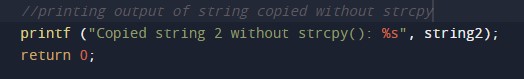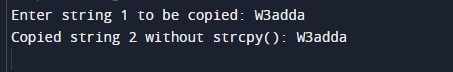 #include <stdio.h> int main() { //declaring variables char string1[100], string2[100], i; //taking input string from the user printf("Enter string 1 to be copied: "); //putting string in 1 variable fgets(string1, sizeof(string1), stdin); //Adding that string to another variable for (i = 0; string1[i] != '\0'; ++i) { string2[i] = string1[i]; } string2[i] = '\0'; //printing output of string copied without strcpy printf ("Copied string 2 without strcpy(): %s", string2); return 0; } |