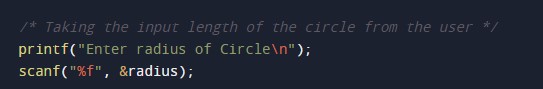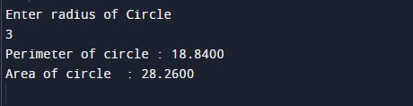 /* C Program to find area and circumference of a circle */ #include <stdio.h> int main() { /* Declaring the variable for the program for storing the data */ float radius, perimeter,area; //radius = to store the length of the side of circle //perimeter = to store the side of the perimeter //area = to store the side of the area /* Taking the input length of the circle from the user */ printf("Enter radius of Circle\n"); scanf("%f", &radius); /* Calculating Perimeter of circle = 2 (length + width) */ perimeter = 2*radius*3.14; printf("Perimeter of circle : %0.4f\n", perimeter); /* Calculating Area of circle = length * width */ area = 3.14*radius*radius; printf("Area of circle : %0.4f\n", area); return 0; } |