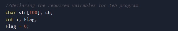 /* C Program to find First Occurrence of a Character in a String */ #include <stdio.h> #include <string.h> int main() { //declaring the required vairables for teh program char str[100], ch; int i, Flag; Flag = 0; //Taking input string from the user printf("\n Please Enter any String : "); gets(str); //taking the input character to look into the string printf("\n Please Enter the Character that you want to Search for : "); scanf("%c", &ch); //Searching the first occurrence of that number. for(i = 0; i <= strlen(str); i++) { if(str[i] == ch) { Flag++; break; } } //Printing the output position in the result of that string if(Flag == 0) { printf("\n Sorry!! We haven't found the Search Character '%c' ", ch); } else { printf("\n The First Occurrence of the Search Element '%c' is at Position %d ", ch, i + 1); } return 0; } |