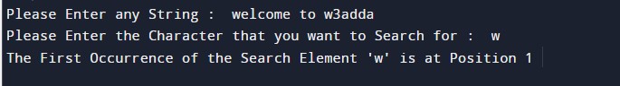 Let us take the example program from the below code to search for the first occurrence of that Character.