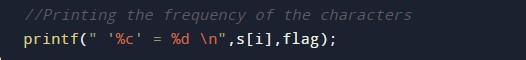 /* C Program to Find Frequency of each Character in a String */ #include <string.h> int main() { //declaring the required variables for the program char s[1000]; int i,j,k,flag=0,n; //Taking the input string from the user. printf("Enter the string : "); gets(s); //finding the length of string for(j=0;s[j];j++); n=j; printf(" frequency count character in string:\n"); //Finding the frequency of the characters for(i=0;i<n;i++) { flag=1; if(s[i]) { for(j=i+1;j<n;j++) { if(s[i]==s[j]) { flag++; s[j]='\0'; } } //Printing the frequency of the characters printf(" '%c' = %d \n",s[i],flag); } } return 0; } |