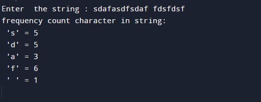 Let us take the example program from the below code to find the Frequency of each Character in a String.