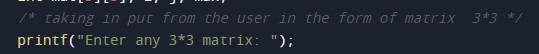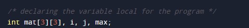/* C Program to find Largest Element in Matrix */ #include<stdio.h> int main() { /* declaring the variable local for the program */ int mat[3][3], i, j, max; /* taking in put from the user in the form of matrix 3*3 */ printf("Enter any 3*3 matrix: "); /* Reading the matrix from the user with the help of for loop */ for(i=0; i<3; i++) { for(j=0; j<3; j++) scanf("%d", &mat[i][j]); } /* Finding the largest element in the matrix with the help of loop */ max = mat[0][0]; for(i=0; i<3; i++) { for(j=0; j<3; j++) { if(max<mat[i][j]) max = mat[i][j]; } } /* Printing the output largest number from the matrix */ printf("\nLargest Element = %d", max); return 0; } |