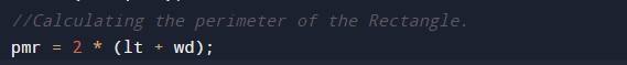 In this tutorial, we will create a program, that will find the Perimeter of the Rectangle. we will First, take the length and the width of the Rectangle from the user. Then we will calculate the Perimeter of the Rectangle using arithmetic expressions / the formulae for the Perimeter of the Rectangle. At last, we will print the Perimeter of the Rectangle.