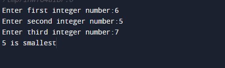 #include<stdio.h> int main() { //declaring variables int no1,no2,no3; //taking first integer number from the user. printf("Enter first integer number:"); //Scanning the input integer scanf("%d",&no1); //taking second integer number from the user. printf("Enter second integer number:"); //Scanning the input integer scanf("%d",&no2); //taking third integer number from the user. printf("Enter third integer number:"); //Scanning the input integer scanf("%d",&no3); //calculating the smallest of three number if(no1 < no2 && no1 < no3) { //printing the smallest of three number printf("%d is smallest",no1); } else if(no2 < no3) { //printing the smallest of three number printf("%d is smallest",no2); } else { //printing the smallest of three number printf("%d is smallest",no3); } return 0; } |