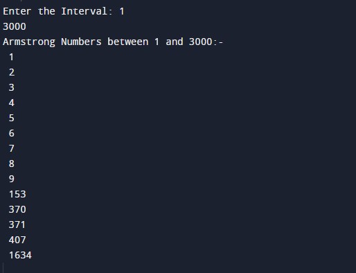 /* C Program to Generate Armstrong Numbers */ #include<stdio.h> int main() { /* Declaring the variables for the program */ int no1, no2, flag, noOfDigit, num, res=0, rem, pow, i; /* Taking the range of numbers between which the we need to get the Armstrong Numbers */ printf("Enter the Interval: "); scanf("%d%d", &no1, &no2); //prinitng the armstrong numbers printf("\nArmstrong Numbers between %d and %d:-\n", no1, no2); while(no1<=no2) { flag = no1; noOfDigit=0; while(flag>0) { flag = flag/10; noOfDigit++; } num = no1; while(num>0) { rem = num%10; pow = 1; i = 0; while(i<noOfDigit) { pow = pow*rem; i++; } res = res + pow; num = num/10; } if(res==no1) //prinitng the armstrong numbers printf(" %d\n", res); no1++; res = 0; } return 0; } |