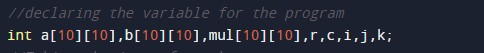 1. Declaring the variables for the program. 2. Taking the input size of matrix. 3. Taking the input elements of matrix. 4. Calculating the<strong> Multiply Two Matrices</strong>. 5. Printing the calculated elements. 6. End Program. |