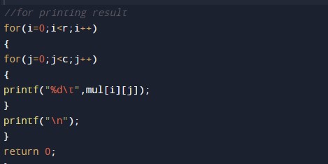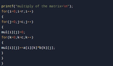 /* C Program to Multiply Two Matrices */ #include<stdio.h> #include<stdlib.h> int main() { //declaring the variable for the program int a[10][10],b[10][10],mul[10][10],r,c,i,j,k; //Taking the input from the user printf("enter the number of row="); scanf("%d",&r); printf("enter the number of column="); scanf("%d",&c); //taking input elements of matrices printf("enter the first matrix element=\n"); for(i=0;i<r;i++) { for(j=0;j<c;j++) { scanf("%d",&a[i][j]); } } printf("enter the second matrix element=\n"); for(i=0;i<r;i++) { for(j=0;j<c;j++) { scanf("%d",&b[i][j]); } } printf("multiply of the matrix=\n"); for(i=0;i<r;i++) { for(j=0;j<c;j++) { mul[i][j]=0; for(k=0;k<c;k++) { mul[i][j]+=a[i][k]*b[k][j]; } } } //for printing result for(i=0;i<r;i++) { for(j=0;j<c;j++) { printf("%d\t",mul[i][j]); } printf("\n"); } return 0; } |