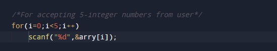 #include <stdio.h> int main() { //declaring the variables for the program int arry[5],i; //taking input from the user printf("Enter 5 Numbers:\n"); /*For accepting 5-integer numbers from user*/ for(i=0;i<5;i++) scanf("%d",&arry[i]); //printing the Even numbers in the out put printf("Even Numbers in Array are:\n"); for(i=0;i<5;i++) { if(arry[i]%2==0) //Check number is Even printf("%d ",arry[i]); } return 0; } |