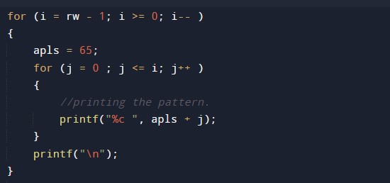 #include <stdio.h> int main() { /* Declaring the required variables for the program. */ int i, j, rw, apls; //i = it will hold the integer value to control the loop. //j = it will hold the integer value to control the loop. //rw = it will hold the integer value for number of rows. //Taking the input number of rows form the user. printf("Enter K Shape alphabet Pattern rows = "); scanf("%d",&rw); //printing the pattern by the for loop. printf("\n The K Shape alphabet/Characters Pattern \n"); for (i = rw - 1; i >= 0; i-- ) { apls = 65; for (j = 0 ; j <= i; j++ ) { //printing the pattern. printf("%c ", apls + j); } printf("\n"); } for (i = 1 ; i < rw; i++ ) { apls = 65; for (j = 0 ; j <= i; j++ ) { printf("%c ", apls + j); } printf("\n"); } return 0; } |