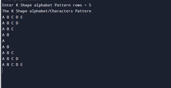 In this program, we will first take the input number of rows by the user. Then we will generate the K shape pattern using the for loops and fill it with Alphabetical values. Printing the pattern filled with numbers.