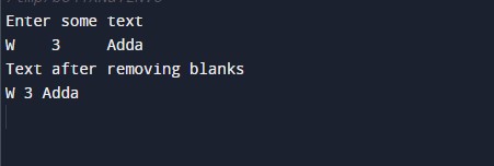 #include <stdio.h> int main() { //declaring the variables char str[100], blank[100]; int c = 0, d = 0; //Taking the input from the user printf("Enter some text\n"); gets(str); //filtering the string while (str[c] != '\0') { if (!(str[c] == ' ' && str[c+1] == ' ')) { blank[d] = str[c]; d++; } c++; } blank[d] = '\0'; //printing the output printf("Text after removing blanks\n%s\n", blank); return 0; } |