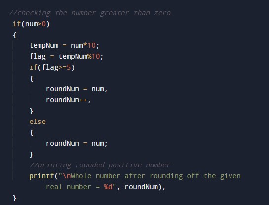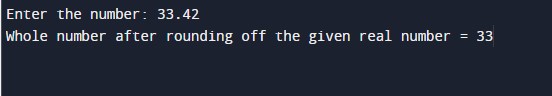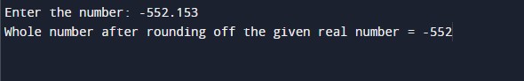 #include<stdio.h> int main() { //declaring the variables for the program float num; int flag, roundNum, tempNum; //Taking the input number from the user printf("Enter the number: "); scanf("%f", &num); //checking the number greater than zero if(num>0) { tempNum = num*10; flag = tempNum%10; if(flag>=5) { roundNum = num; roundNum++; } else { roundNum = num; } //printing rounded positive number printf("\nWhole number after rounding off the given real number = %d", roundNum); } //checking the number smaller than zero else if(num<0) { num = -(num); tempNum = num*10; flag = tempNum%10; if(flag>=5) { roundNum = num; roundNum--; } else { roundNum = num; } //printing rounded negative number printf("\nWhole number after rounding off the given real number = -%d", roundNum); } else //printing given number in output { printf("\nThe given number is 0"); } return 0; } |