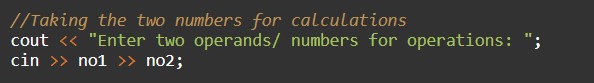 /* C++ Program to Perform Addition, Subtraction, Multiplication, and Division of Two Numbers using switch case*/ # include <iostream> using namespace std; int main() { //declaring the requred variables for the program. char op; float no1, no2; //taking input symbol from the user for performing the calculations cout << "Enter operator: +, -, *, /: "; cin >> op; //Taking the two numbers for calculations cout << "Enter two operands/ numbers for operations: "; cin >> no1 >> no2; switch(op) { case '+': //Priniting the add operation for the values. cout << no1 << " + " << no2 << " = " << no1 + no2; break; case '-': //Priniting the subtract operation for the values. cout << no1 << " - " << no2 << " = " << no1 - no2; break; case '*': //Priniting the multiply operation for the values. cout << no1 << " * " << no2 << " = " << no1 * no2; break; case '/': //Priniting the divide operation for the values. cout << no1 << " / " << no2 << " = " << no1 / no2; break; default: // If the operator is other than +, -, * or /, error message is shown cout << "Error! operator is not correct"; break; } return 0; } |