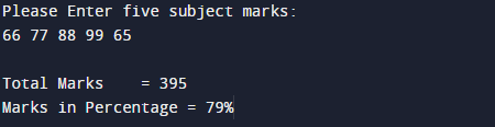 And we will get the required output.This program allows user to enter five values of five different subjects. And then calculate the Total and Percentage of those Five Subjects.