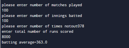 By taking three values ” runs, matches, and number of not-out” represent number of runs scored and innings played by the batsman and number of times remained Not Out. respectively.For calculating Batting Average