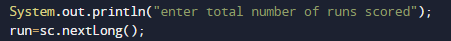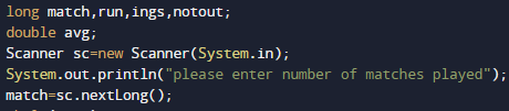 And in the next statement user will be prompted to enter different values and which will be assigned to variables “match,run , notout , ings” respectevely.