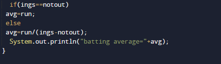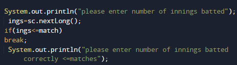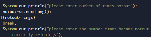 // Java program to calculate average of a batsman... import java.util.Scanner; class Bat_Average { public static void main(String arg[]) { // Declaring variables.. long Match,run,ings,notout; double avg; // taking values form user Scanner sc=new Scanner(System.in); System.out.println("please enter number of matches played"); Match=sc.nextLong(); while(true) { System.out.println("please enter number of innings batted"); innings=sc.nextLong(); if(ings<=Match) break; System.out.println("please enter number of innings batted correctly <=matches"); } while(true) { System.out.println("please enter number of times notout"); notout=sc.nextLong(); if(notout<=ings) break; System.out.println("please enter the number times became notout correctly <=innings"); } System.out.println("enter total number of runs scored"); run=sc.nextLong(); if(ings==notout) avg=runs; else avg=run/(ings-notout); System.out.println("batting average="+avg); } } |