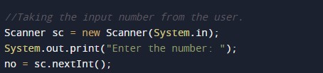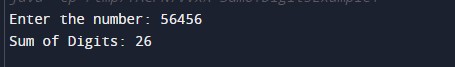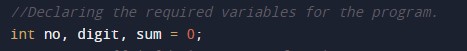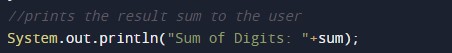 import java.util.Scanner; public class SOD//Main class of the prorgam. { //Body of the main function of the program. public static void main(String args[]) { //Declaring the required variables for the program. int no, digit, sum = 0; //no = it will hold the integer for the input //digit = it will hold the digits of the number //sum = it will hold the sum of the digits //Taking the input number from the user. Scanner sc = new Scanner(System.in); System.out.print("Enter the number: "); no = sc.nextInt(); //Adding the digits of the number while(number > 0) { //finds the last digit of the given number digit = no % 10; //adds last digit to the variable sum sum = sum + digit; //removes the last digit from the number no = no / 10; } //prints the result sum to the user System.out.println("Sum of Digits: "+sum); } } |