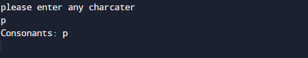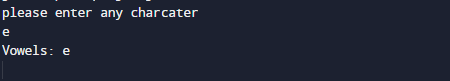// Java program t fin given character is vowel or Consonant import java.util.Scanner; class Cont_vow_cons { public static void main(String[] args) { // Declaring and taking value form user... Scanner sc = new Scanner(System.in); System.out.println("please enter any charcater"); char ch = sc.next().charAt(0); // checking character is any of a, e, i, o, u .. if (ch == 'a' || ch == 'e' || ch == 'i' || ch == 'o' || ch == 'u') { System.out.println("Vowels: " + ch); } // check if character is not in between a to z else if ((ch >= 'a' && ch <= 'z')) { System.out.println("Consonants: " + ch); } } } |