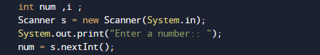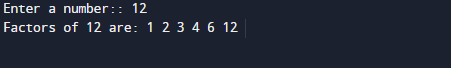 import java.util.Scanner; public class Factor { public static void main(String[] args) { // Declaring vriables.. int num ,i ; Scanner s = new Scanner(System.in); System.out.print("Enter a number:: "); num = s.nextInt(); // takin value from user System.out.print("Factors of " + num + " are: "); // loop run till number.. for (i = 1; i <= num; ++i) { if (num % i == 0) // finding factor { System.out.print(i + " "); // Printing fators } } } } |