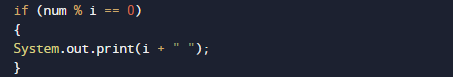 Within the for loop in each iteration we will check the condition for i is a factor of number or not. To find factor we use divisibility of number by using modulo operator(%).