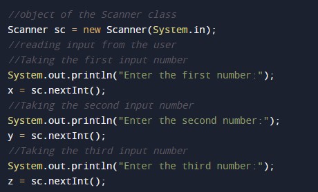 import java.util.Scanner; //Importing the Scanner class in program public class Great//Main Class Of the function { //Body of the main function of the program. public static void main(String[] args) { //Declaring the required variables for the program. int x, y, z, greatest, flag; //x = it will hold the first number. //y = it will hold the second number. //z = it will hold the third number //object of the Scanner class Scanner sc = new Scanner(System.in); //reading input from the user //Taking the first input number System.out.println("Enter the first number:"); x = sc.nextInt(); //Taking the second input number System.out.println("Enter the second number:"); y = sc.nextInt(); //Taking the third input number System.out.println("Enter the third number:"); z = sc.nextInt(); //comparing x and y and storing the greatest number in a flag variable flag=x>y?x:y; //comparing the flag variable with z and storing the result in the variable greatest=z>flag?z:flag; //prints the greatest number System.out.println("The greatest number is: "+greatest); } } |