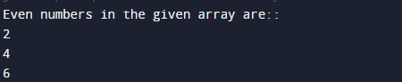 In this program we will find number in an array are even or odd using if else statement and loop. We would first declared and initialized the required variables. Next, we will find that number is even or odd.lets have a look at the code.