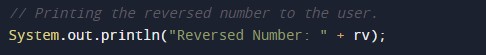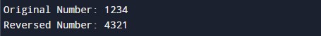 //Java Program to Reverse Given Number class RevNo {//Class for the program. //Body of the main function for the program. public static void main(String[] args) { // Declaring the required variables for the program. int no,rv; // Assigning the values to the variables. no = 1234; rv = 0; // no,rv = it will hold the integer value for the program. // printing the original value to the user. System.out.println("Original Number: " + no); // run loop until no becomes 0. // Reversing the number using the while loop. while(no != 0) { // get last digit from no. int digit = no % 10; rv = rv * 10 + digit; // remove the last digit from no. no /= 10; } // Printing the reversed number to the user. System.out.println("Reversed Number: " + rv); } } |