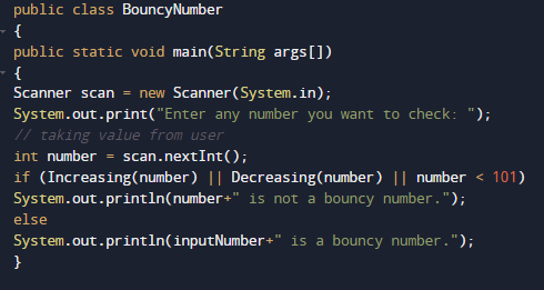 In this program we will learn to create a program to check Given number is Bouncy Number or not. We would first declared and initialized the required variables. Next, we would prompt user to input a number and later we will find it is bouncy or not.Lets gave a look at the program.