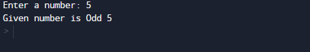 In our program below we will check given number is Even or Odd .First we would declared and initialized the required variables. Next, we would prompt user to input the value. Later we will find entered value is Even or Odd.