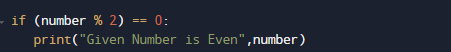 # Python program to check if the input number is even r odd. number = int(input("Enter a number: ")) # checking condition for even number or not if (number % 2) == 0: print("Given Number is Even",number) else: print("Given number is Odd",number) |