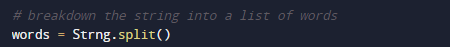 We take a String form the user and using the split() method string breakdown into a list of words.The function split(), splits the string at “white-spaces”.